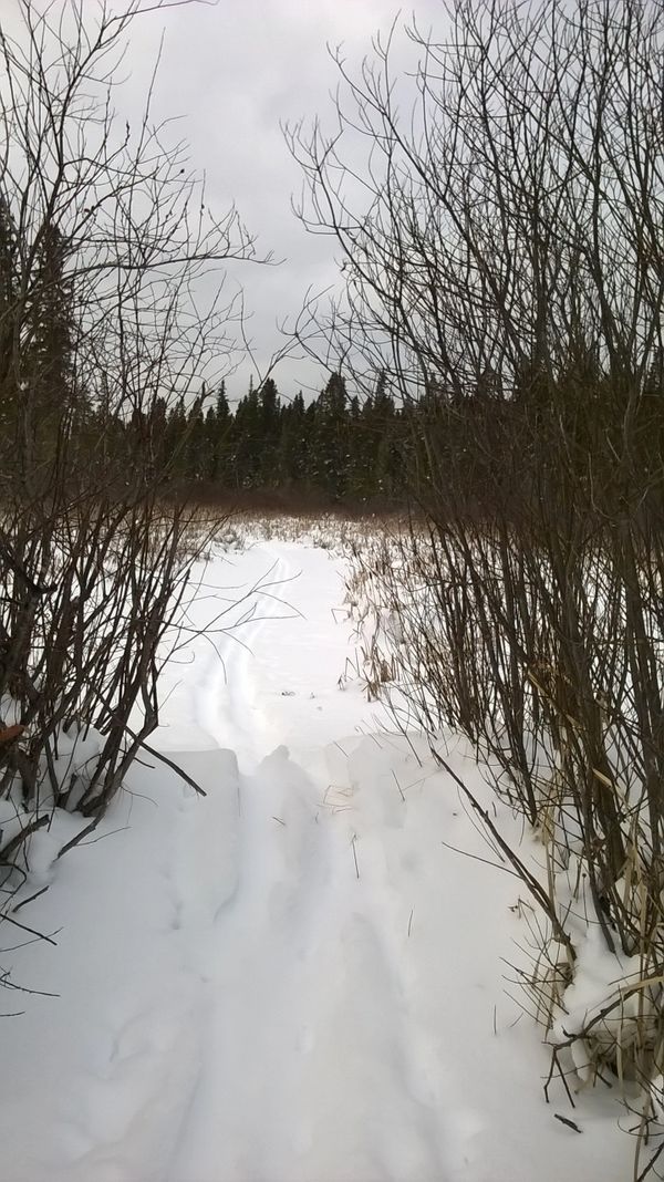 Into the swamp I went. I continued to follow the ski tracks through and over the bent cattails, rather than follow the vegetation less trail of snow-covered ice. I looked for a cut trail to the left. I kept looking for a break in the trees. Two birds flew above and past, landed high in the spruce tree tops as I stopped to spot them. I asked them where the trail was. I ventured a little further, and in line with where they were, was the trail. I placed down my bag, went to the right and through a break in the trees over a beaver dam, a little past over the frozen waterway and another path to follow, but that would be another time. Back to my bag I went before a bird or animal found it.